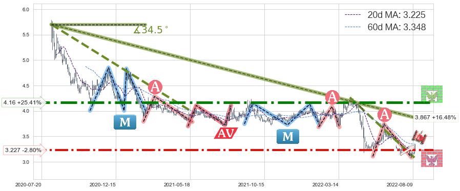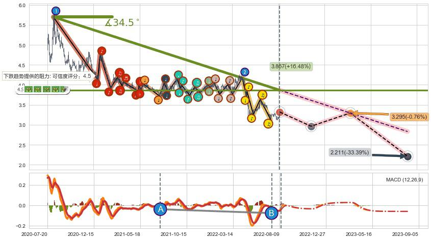♘ 在最后的下跌阶段2020-08-06至2022-08-11,存在 持续未破位的阻力位 ,阻力价格3.867,可信任强度87.31%,其距离最后价格3.320相差 +16.48%