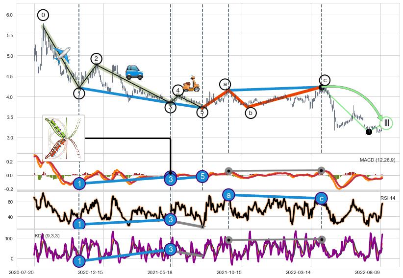 ➢ 1,3,5驱动浪MACD, RSI, KDJ走势都出现【常规背离】反转信号增强