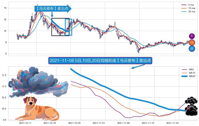 ⚀ 2021-10-21日-2021-11-24日显现 5日-10日-20日均线 【乌云密布】卖出点 看空信号,后市看跌,卖出
