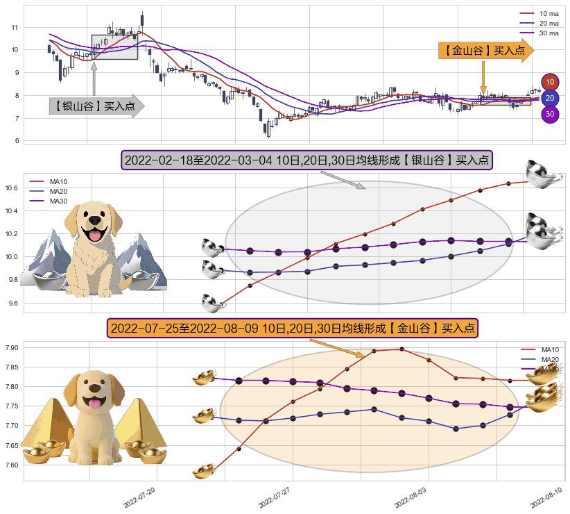 ⚃ 2022-07-26-日至2022-08-09-日显现 10日-20日-30日均线 【金山谷】买入点 其再次确认了买入信号,可靠性更强,买入