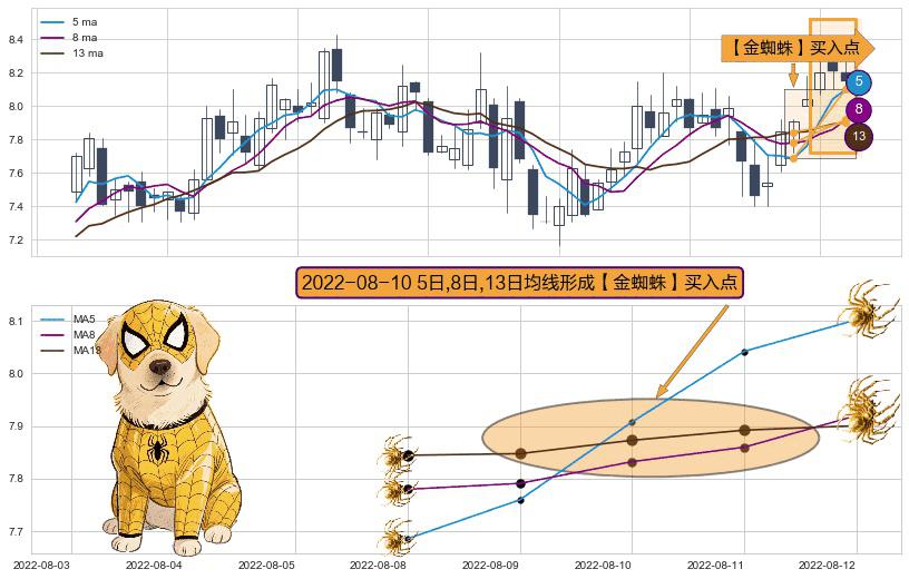 ⚀ 2022-08-10日显现 5日-8日-13日均线 【金蜘蛛】买入点 看多信号,后市看涨,买入