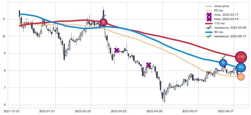 ⚄ 价格在均线遇到阻力后再次向下回落了【极短】距离, 第⑦卖出点 阻力效果【等待验证】