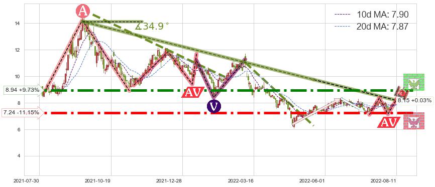 🦴 长线均值回复组合短线趋势跟踪[强阻力信号]2021-09-10-2022-05-20下跌趋势依然成立(下跌趋势跟踪依然存在),短线价格略微上行反弹(均值回复猜想),即将接近下跌趋势提供的未破位阻力价格:8.15。
