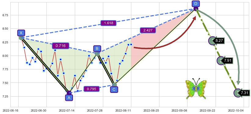 ➣ 未完成【蝴蝶】形态起点X: 2022-06-17, 已到达C点: 2022-08-03, 预测最终D点: 2022-09-13, 共62交易日