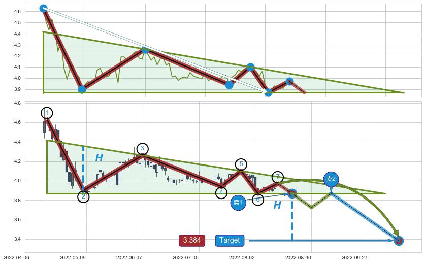 ➣ 【未确认突破,预测即将形成突破】下降三角形整理起点:2022-04-14, 预测突破点:2022-08-19,形态共88交易日