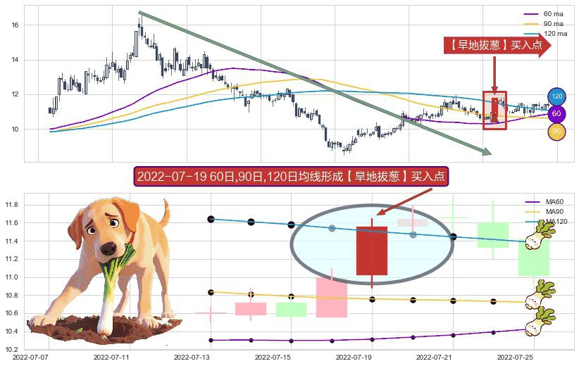 ⚀ 2022-07-19日显现 60日-90日-120日均线 【旱地拔葱】买入点 看多信号,后市看涨,买入