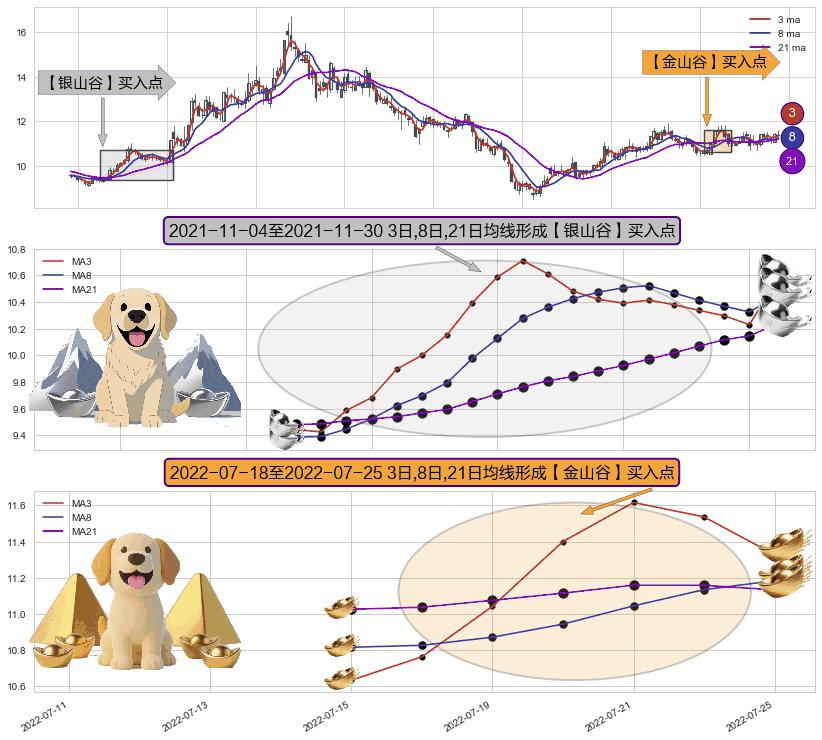 ⚃ 2022-07-19-日至2022-07-25-日显现 3日-8日-21日均线 【金山谷】买入点 其再次确认了买入信号,可靠性更强,买入