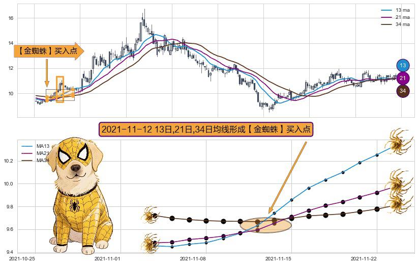 ⚀ 2021-11-12日显现 13日-21日-34日均线 【金蜘蛛】买入点 看多信号,后市看涨,买入