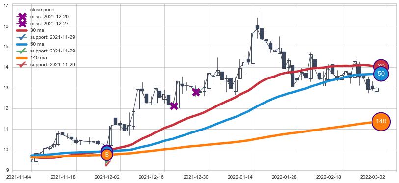 ⚁ MA3和MA8走势平行,且始终保持在短距离内,MA21始终在短中期均线下方,与短中期均线保持一定的距离,微微上行