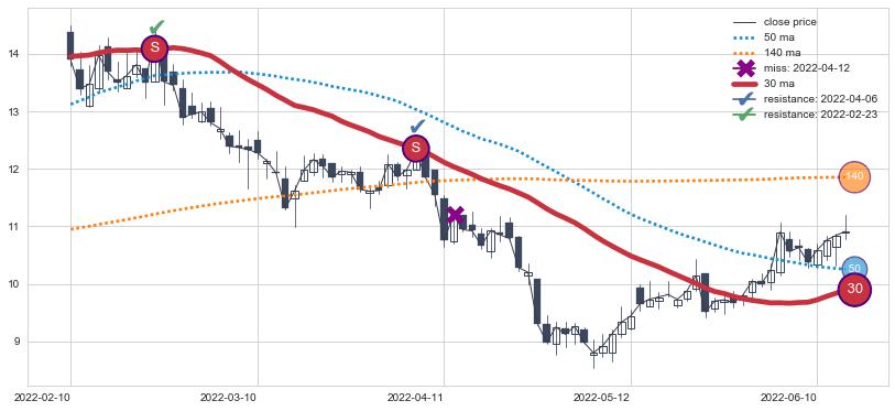 ⚀ 2022-02-25日-2022-06-07日显现 30日-60日-90日均线 【高山滑雪】买入点 看多信号,后市看涨,买入