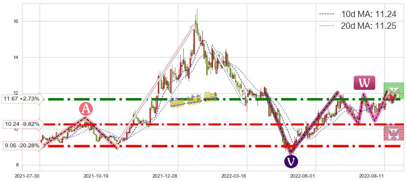 ♘ 阻力价格位11.67,可信任强度89.00%,距离最后交易2022-08-12形成的收盘价格11.36相差 +2.73%