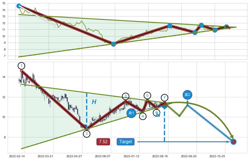 ➣ 【未确认突破,预测即将形成突破】下降【对称】三角形整理起点:2022-02-09, 预测突破点:2022-08-11,形态共126交易日