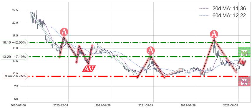 ♘ 阻力价格位16.10,可信任强度55.00%,距离最后交易2022-08-12形成的收盘价格11.34相差 +42.00%