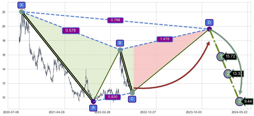 ➣ 未完成【伽利】形态起点X: 2020-07-21, 已到达C点: 2022-08-02, 预测最终D点: 2023-11-17, 共822交易日