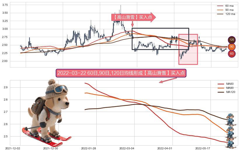 ⚀ 2022-01-20日-2022-05-30日显现 60日-90日-120日均线 【高山滑雪】买入点 看多信号,后市看涨,买入