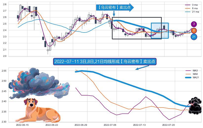 ⚀ 2022-06-27日-2022-07-25日显现 3日-8日-21日均线 【乌云密布】卖出点 看空信号,后市看跌,卖出