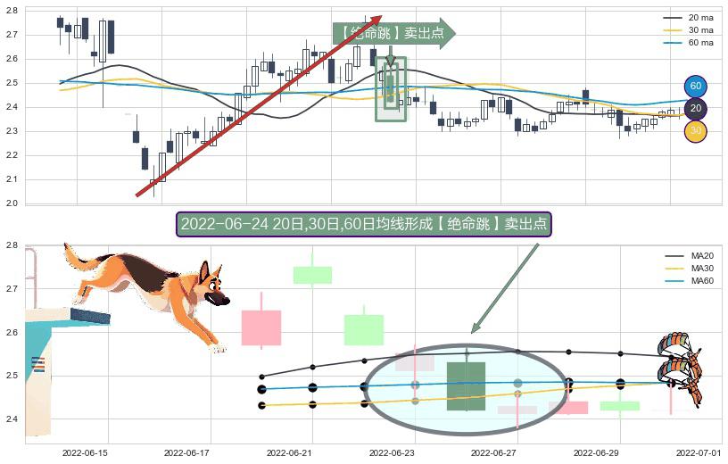 ⚀ 2022-06-24日显现 20日-30日-60日均线 【绝命跳】卖出点 看空信号,后市看跌,卖出