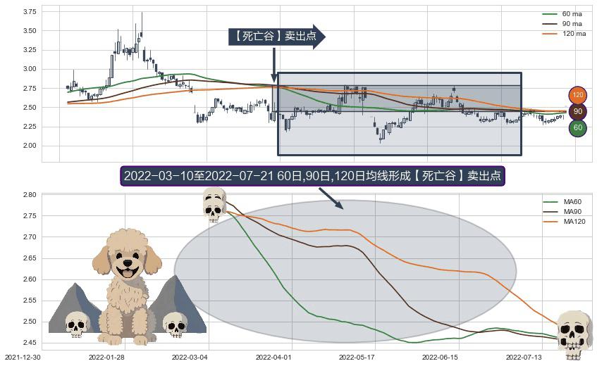 ⚀ 2022-03-11-日至2022-07-21-日显现 60日-90日-120日均线 【死亡谷】卖出点 看空信号,后市看跌,卖出