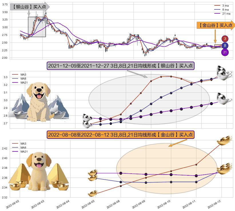 ⚀ 2022-08-09-日至2022-08-12-日显现 3日-8日-21日均线 【金山谷】买入点 其再次确认了买入信号,可靠性更强,买入