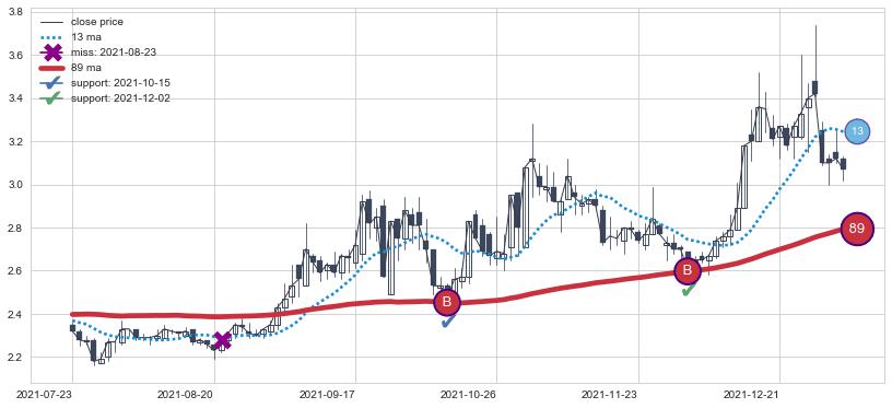 ⚁ MA3和MA8走势平行,且始终保持在短距离内,MA21始终在短中期均线上方,与短中期均线保持一定的距离,微微下行