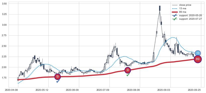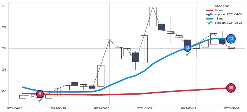 ⚀ 中期均线MA8上穿长期均线MA21形成的交叉是标准 黄金交叉