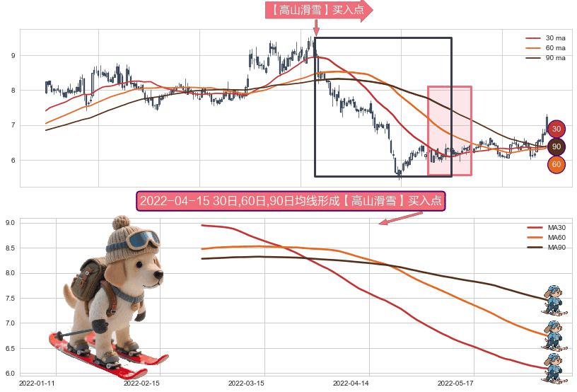 ⚀ 2022-02-25日-2022-06-07日显现 30日-60日-90日均线 【高山滑雪】买入点 看多信号,后市看涨,买入