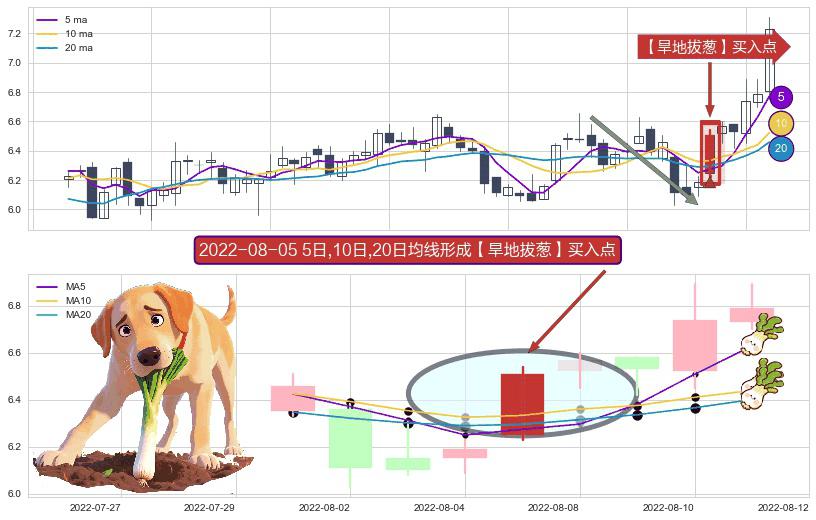 ⚀ 2022-08-05日显现 5日-10日-20日均线 【旱地拔葱】买入点 看多信号,后市看涨,买入