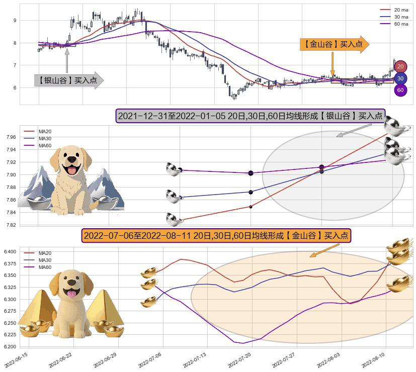 ⚀ 2022-07-07-日至2022-08-11-日显现 20日-30日-60日均线 【金山谷】买入点 其再次确认了买入信号,可靠性更强,买入