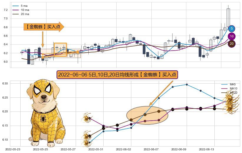 ⚀ 2022-06-06日显现 5日-10日-20日均线 【金蜘蛛】买入点 看多信号,后市看涨,买入