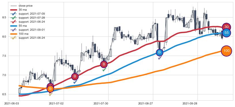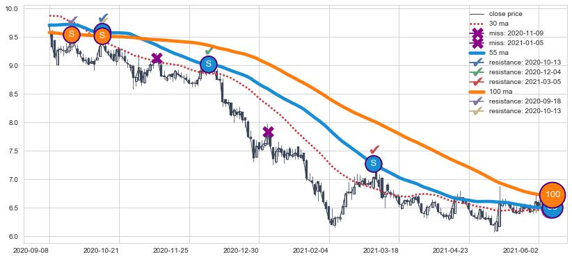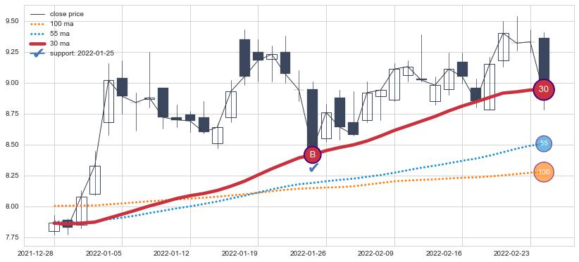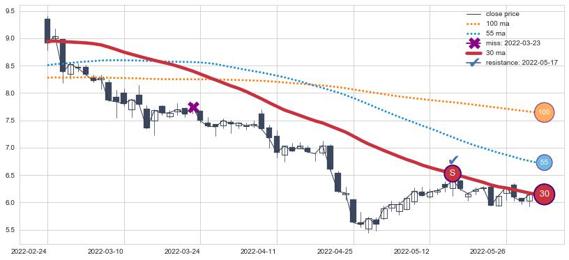 ⚃ 在破位点附近ma走势明显平稳迹象,稍后的走势中ma下垂迹象也出现,信号【可信度中等偏上】