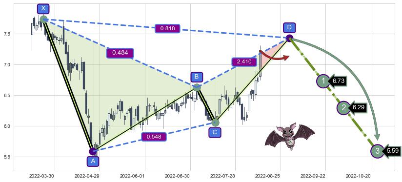 ➣ 未完成【蝙蝠】形态起点X: 2022-03-23, 已到达C点: 2022-07-15, 预测最终D点: 2022-08-31, 共110交易日