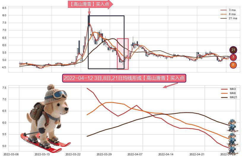⚀ 2022-03-23日-2022-04-27日显现 3日-8日-21日均线 【高山滑雪】买入点 看多信号,后市看涨,买入