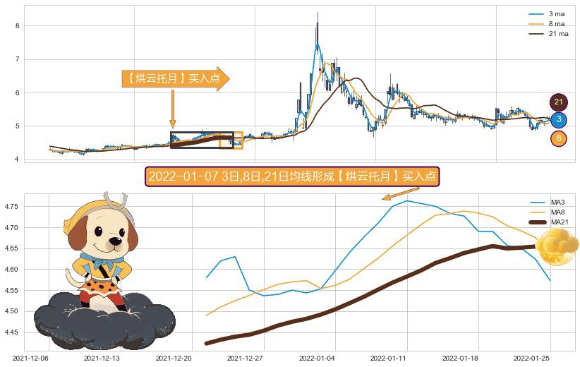 ⚀ 2021-12-21日-2022-01-25日显现 3日-8日-21日均线 【烘云托月】买入点 看多信号,后市看涨,买入
