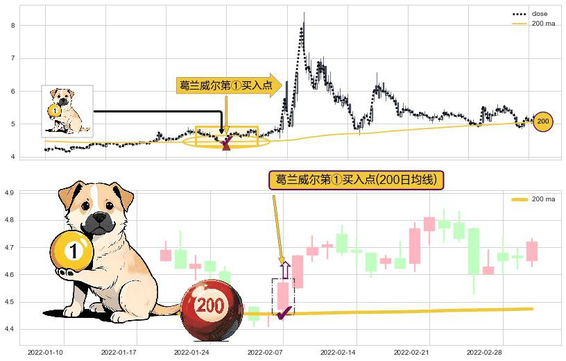 ⚀ 2022-02-07-日显现 葛兰威尔均线 200日均线 第买①入点 走势反转见底信号,后市看涨,买进信号