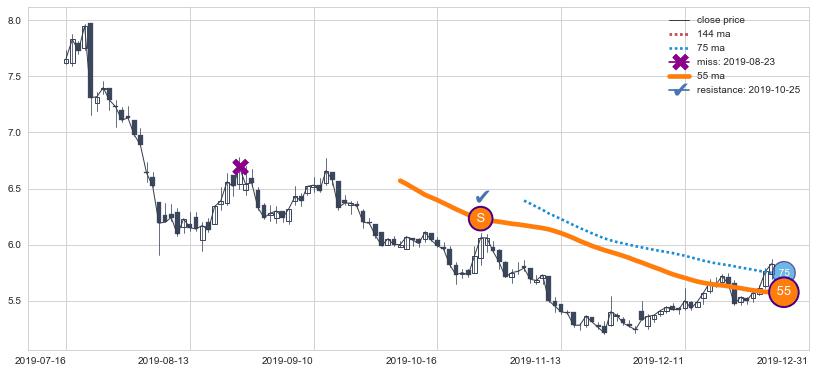 2019-07-16至2019-12-31 慢线与快线呈空头排列, 慢线与快线接触少,无缠绕