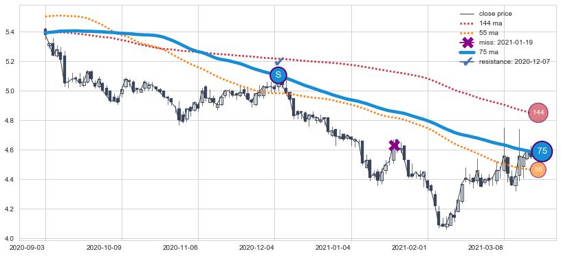 ⚁ MA3和MA8走势平行,且始终保持在短距离内,MA21始终在短中期均线下方,与短中期均线保持一定的距离,微微上行
