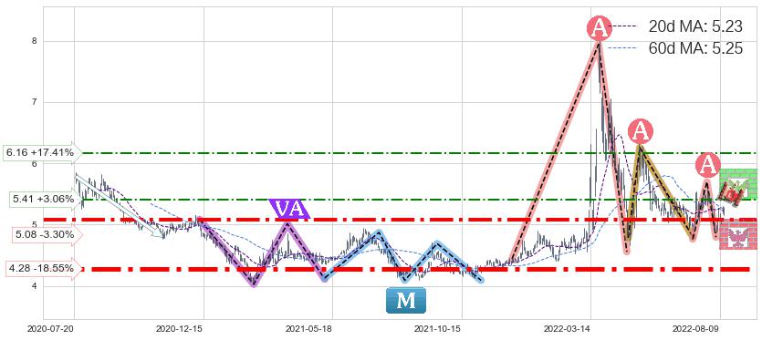 ♘ 阻力价格位5.41,可信任强度45.05%,距离最后交易2022-08-12形成的收盘价格5.25相差 +3.06%
