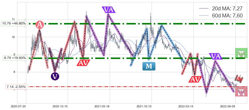 ♘ 支撑价格位7.14,可信任强度54.30%,距离最后交易2022-08-12形成的收盘价格7.33相差 -2.55%