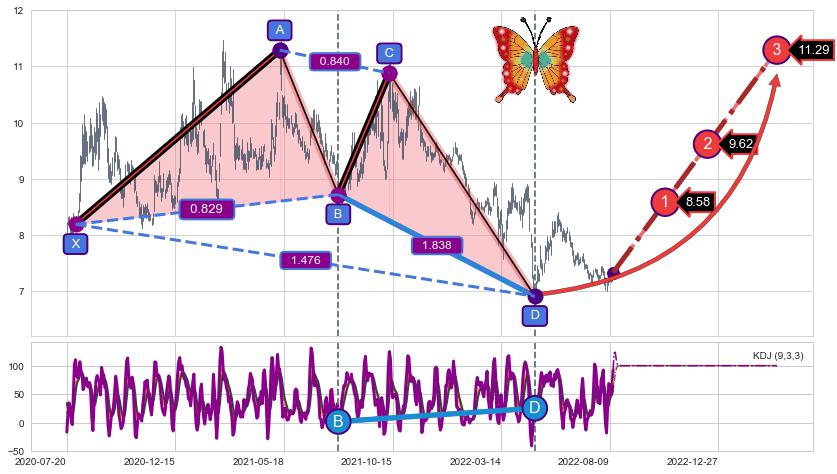 ➣ 已完成【蝴蝶】形态起点X: 2020-07-30, 终点D: 2022-04-28, 共424交易日