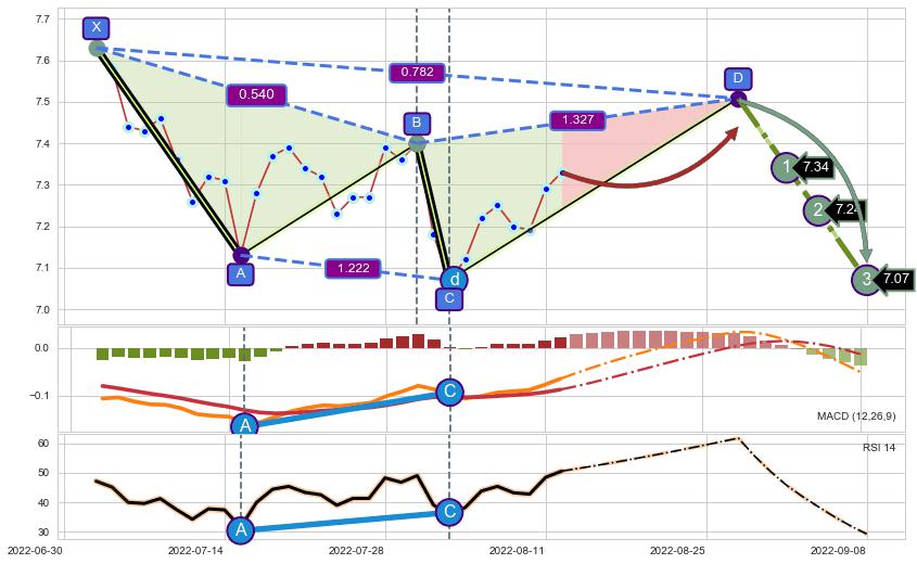 ➣ D点拟合预测价格7.51,距离最后交易收盘价格7.33相差 +2.43%