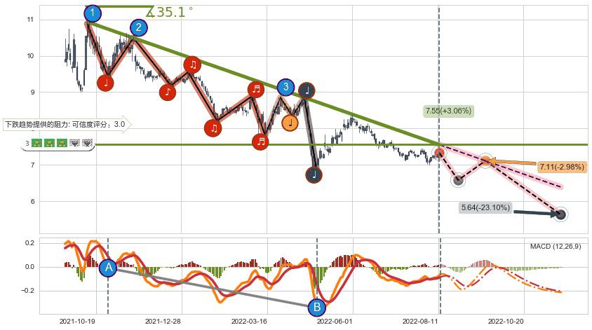 ♘ 在最后的下跌阶段2021-10-12至2022-05-24,存在 持续未破位的阻力位 ,阻力价格7.55,可信任强度75.30%,其距离最后价格7.33相差 +3.06%