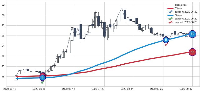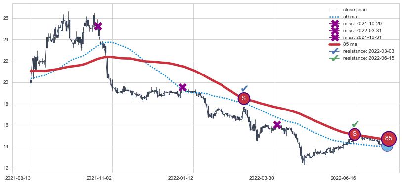 下跌趋势2021-08-13-2022-07-07,均线85确认关键阻力2处
