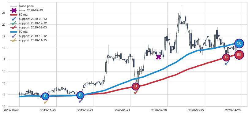 上涨趋势2019-10-28-2020-04-20,均线50, 85确认关键支撑4处