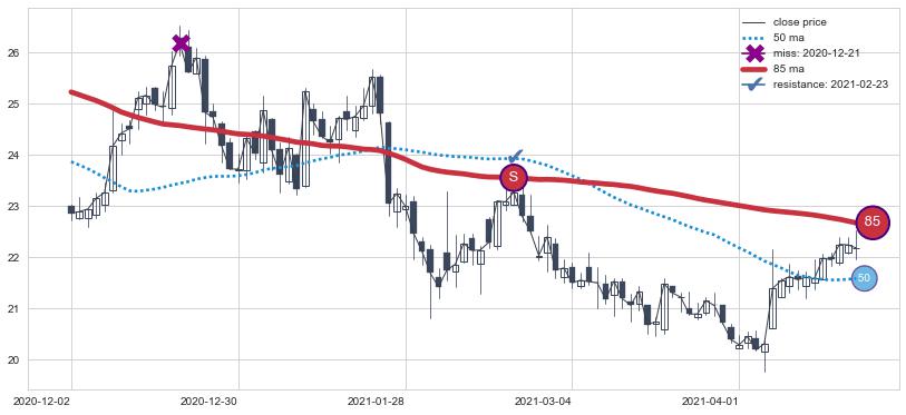 下跌趋势2020-12-02-2021-04-22,均线85确认关键阻力1处