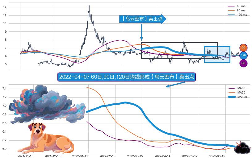 ⚀ 2022-01-10日-2022-06-29日显现 60日-90日-120日均线 【乌云密布】卖出点 看空信号,后市看跌,卖出