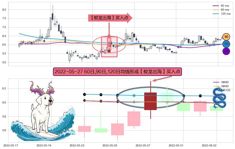 ⚀ 2022-05-27日显现 60日-90日-120日均线 【蛟龙出海】买入点 看多信号,后市看涨,买入
