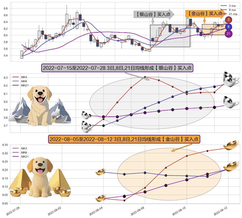 ⚀ 2022-08-08-日至2022-08-12-日显现 3日-8日-21日均线 【金山谷】买入点 其再次确认了买入信号,可靠性更强,买入