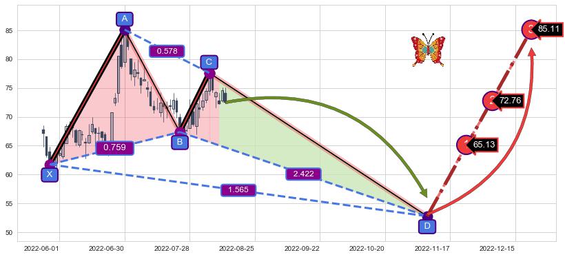 ➣ 未完成【蝴蝶】形态起点X: 2022-05-27, 已到达C点: 2022-08-05, 预测最终D点: 2022-11-08, 共115交易日