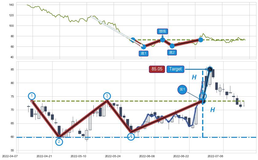 ➢ 【买1】: 激进型 买点 →(2022-06-28: 73.33 )形成突破双重底【反转】形态