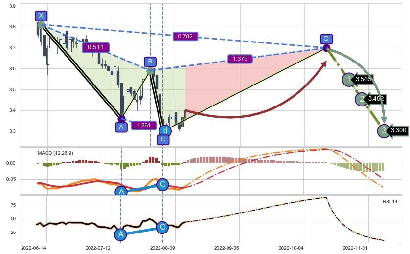 ➣ D点拟合预测价格3.699,距离最后交易收盘价格3.400相差 +8.79%